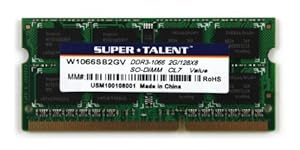 Super Talent Laptop memory is designed for compatibility with a wide range of portable computers. Our fully JEDEC compliant SO-DIMMs are built with only the highest quality components. All new products, new component suppliers, and chnology changes are rigorously tested in a multitude of laptop computers in our Compatibility Labs prior to production. Super Talent Laptop memory is 100% tested. Every SO-DIMM module we build is tested at its rated specs to guarantee functionality. Our SO-DIMMs are backed with Super Talent��s lifetime warranty, and are perfect for upgrades. Features Mfr Part Number: W1066SB2GV Type: DDR3 Capacity: 2 GB Speed: PC8500 1066MHz Size & Bit: 128 x 8 Pins: 204pin ECC: No Registered: No