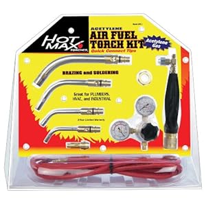 The Hot Max AFA-1 acetylene quick connect air fuel torch kit is an exception torch kit with an exceptional price. The Hot Max AFA-1 is perfect for plumbers, HVAC, industrial users, and DIY people and can solder 1/4" to 6" copper tubing. The AFA-1 comes with quick connect tips so no additional tools are necessary to change tips. The Hot Max AFA-1 tips swirl the flame for maximum heat. The Hot Max AFA-1 comes with quick connect handle and tips, the four most versatile tips made from all brass and stainless construction, a 12' hose with "A" fittings, adapter for both "MC" and "B" tank fittings, a solid brass needle valve, a single stage brass regulator, and a single flint striker.