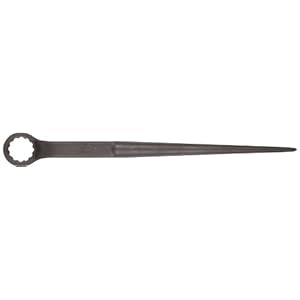 Structural box wrench heads are offset from handle to permit clearance of obstructions. Handles are tapered to align bolt holes. Often called "Box Spud Wrench". Made of forged alloy steel. Industrial black finish. Made in U.S.A. 15/16" Wrench opening. Head measures 1-5/8" diameter by 13/16" thick, 12" overall length. 1-61?64" Offset at end.